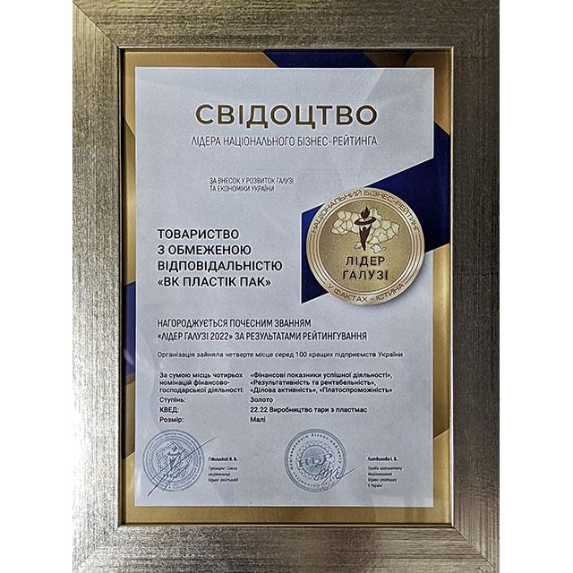 Нагорода "Свідоцтво лідера національного бізнес-рейтинга"